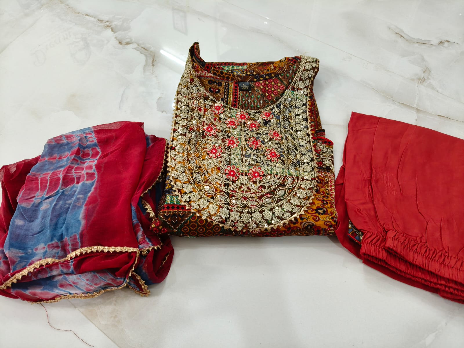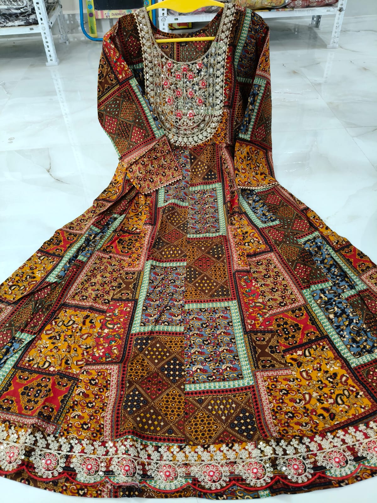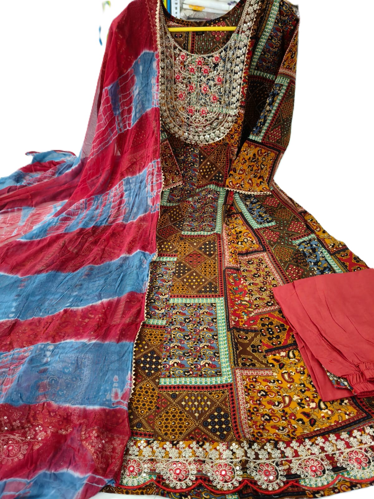 Flared Fit Anarkali Set – Multicolored Anarkali kurti with embroidered neck and lace border, chiffon dupatta, and elastic bottom. (SLUBCOTTON Fabric)