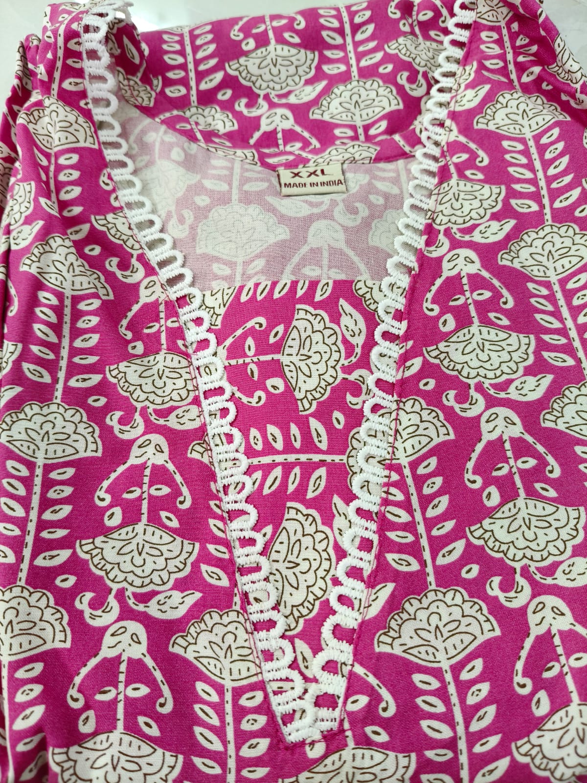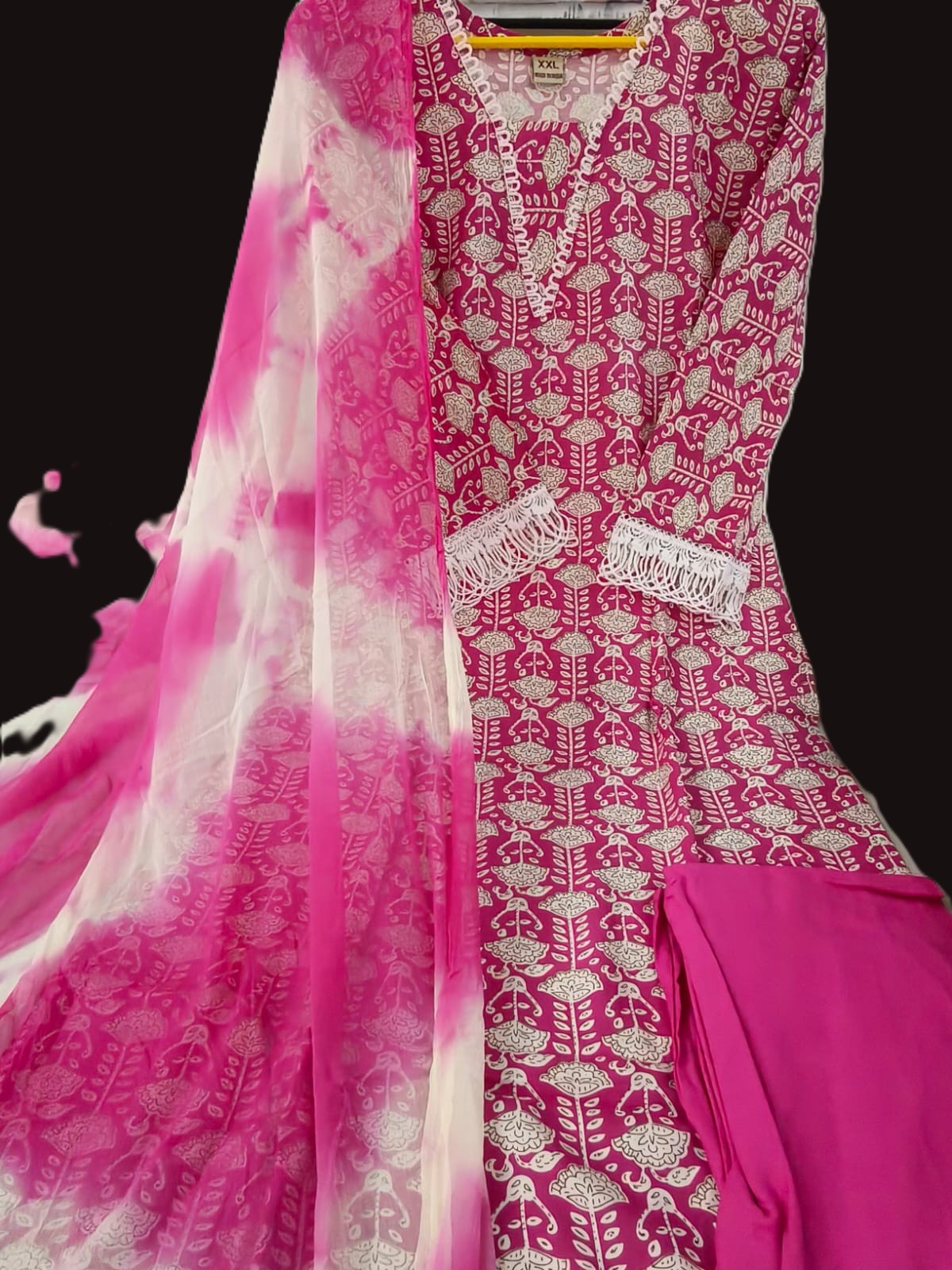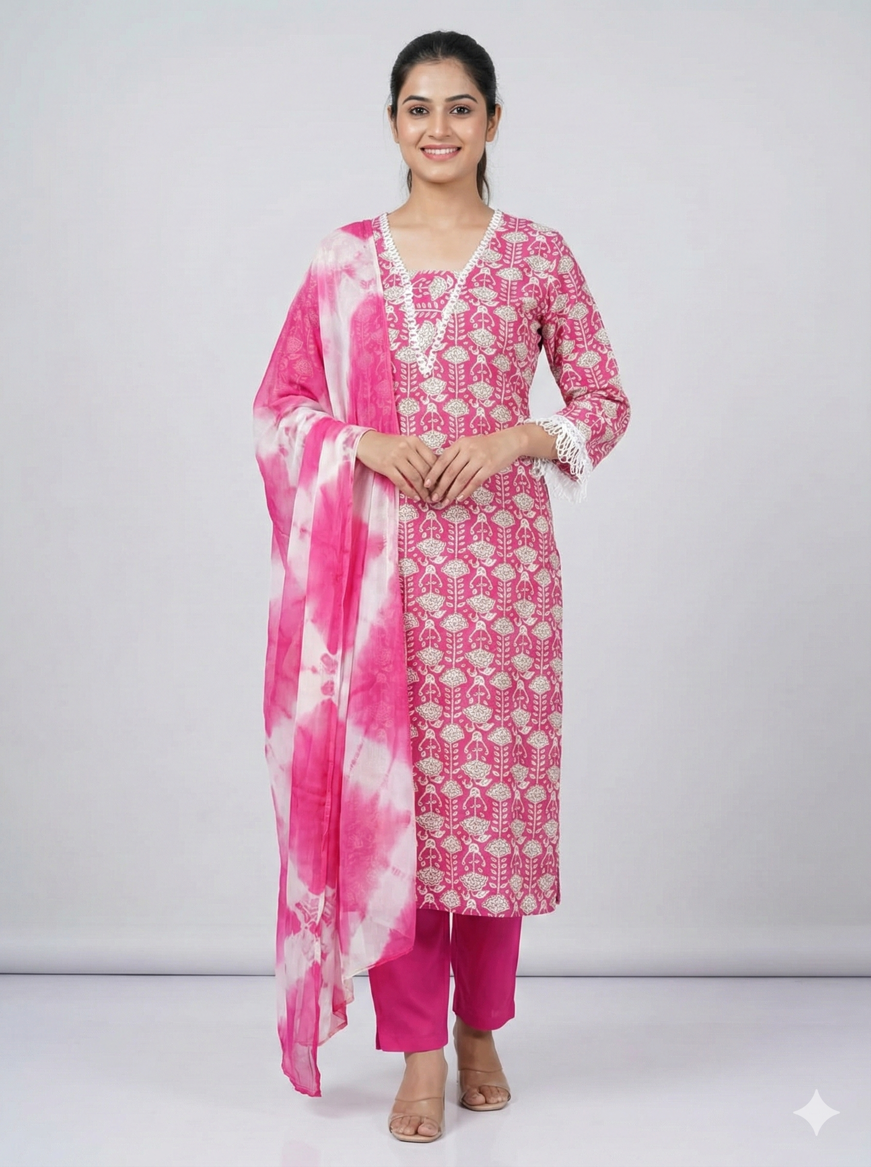 Straight Fit Kurti Set – Pink kurti with floral embroidery and lace accents on neckline/sleeves, matching pink bottoms, and tie-dye chiffon dupatta. (COTTON Fabric)