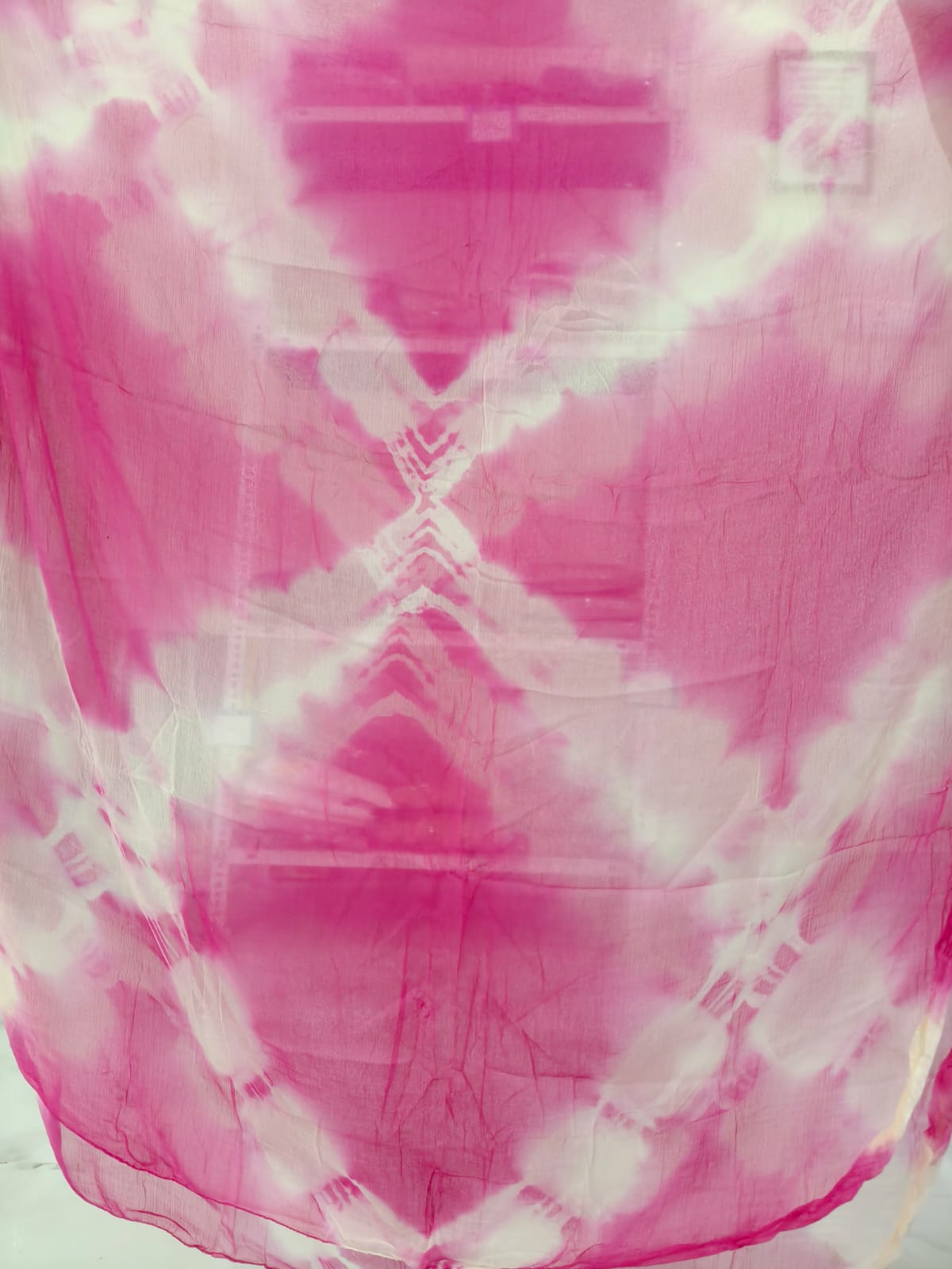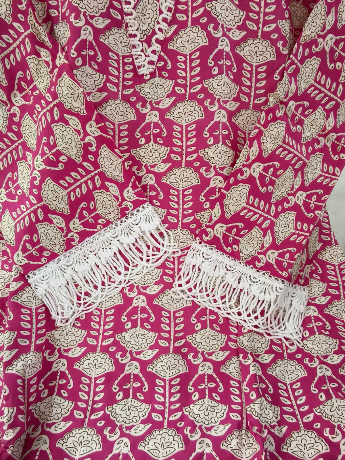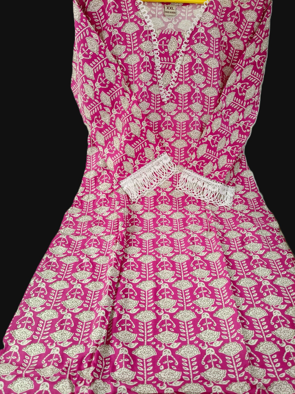 Straight Fit Kurti Set – Pink kurti with floral embroidery and lace accents on neckline/sleeves, matching pink bottoms, and tie-dye chiffon dupatta. (COTTON Fabric)