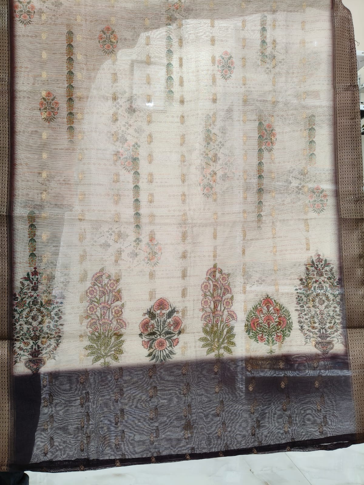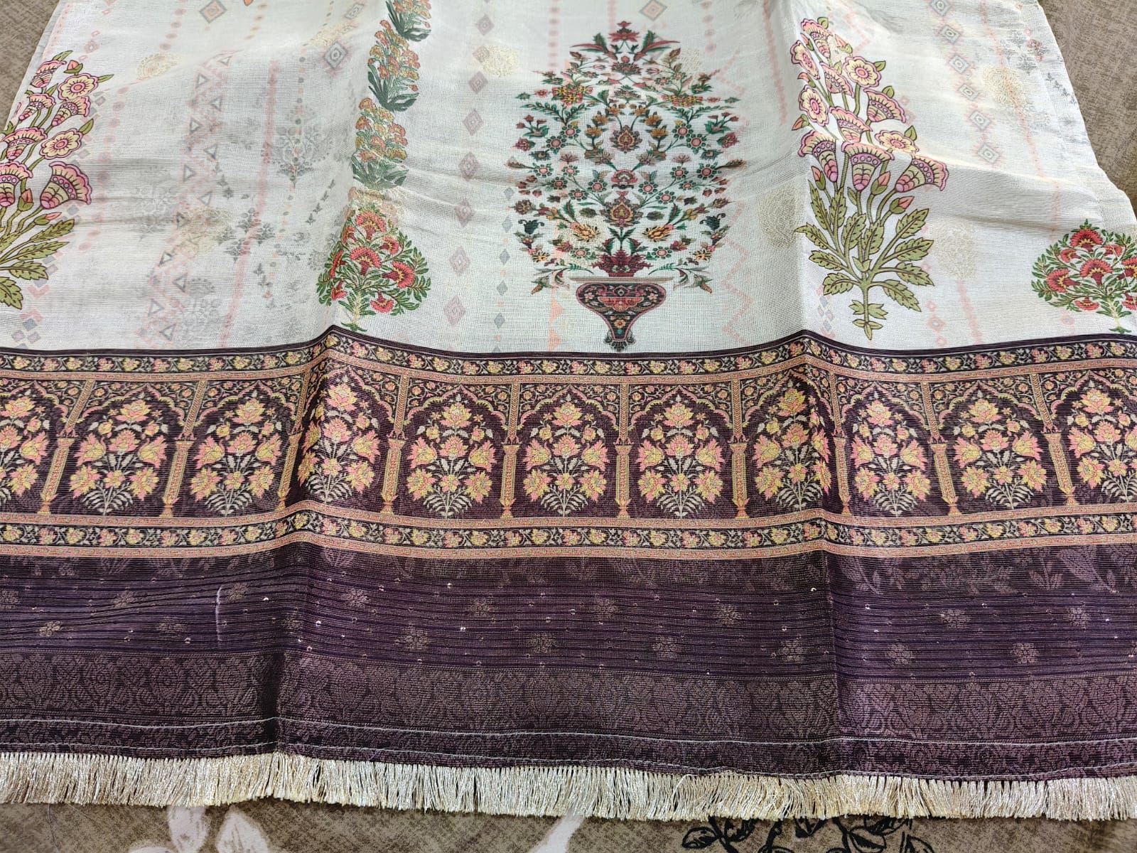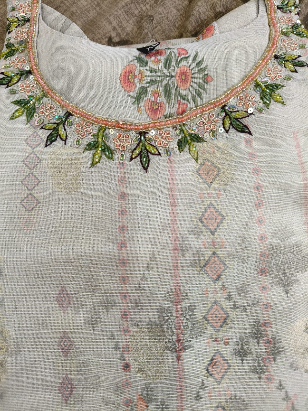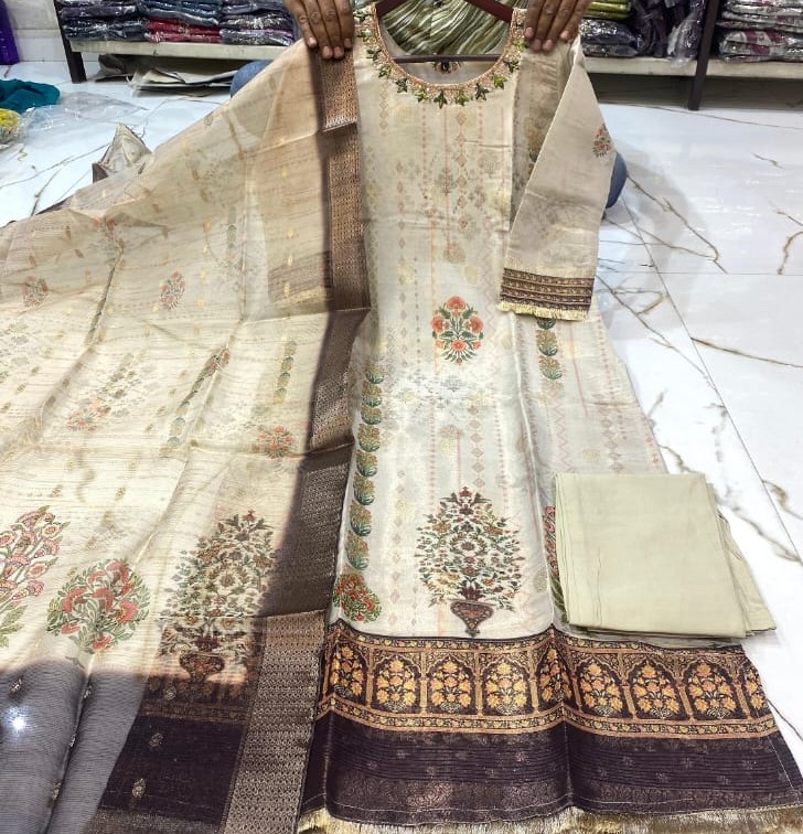 Straight Fit Kurti Set – Cream kurti with gold/orange floral patterns, star embroidery, sleeves with gold strips, matching bottom, and beige printed dupatta. (TISSUE Fabric with Inner Lining)