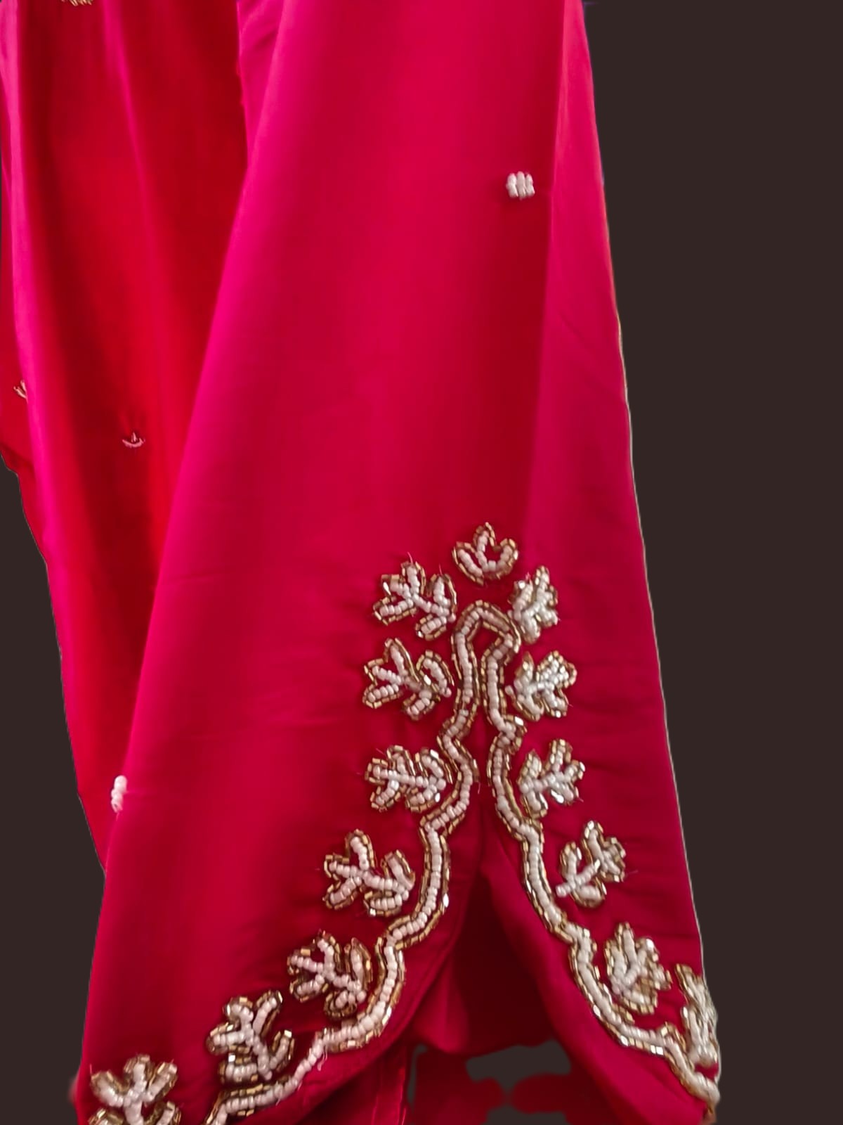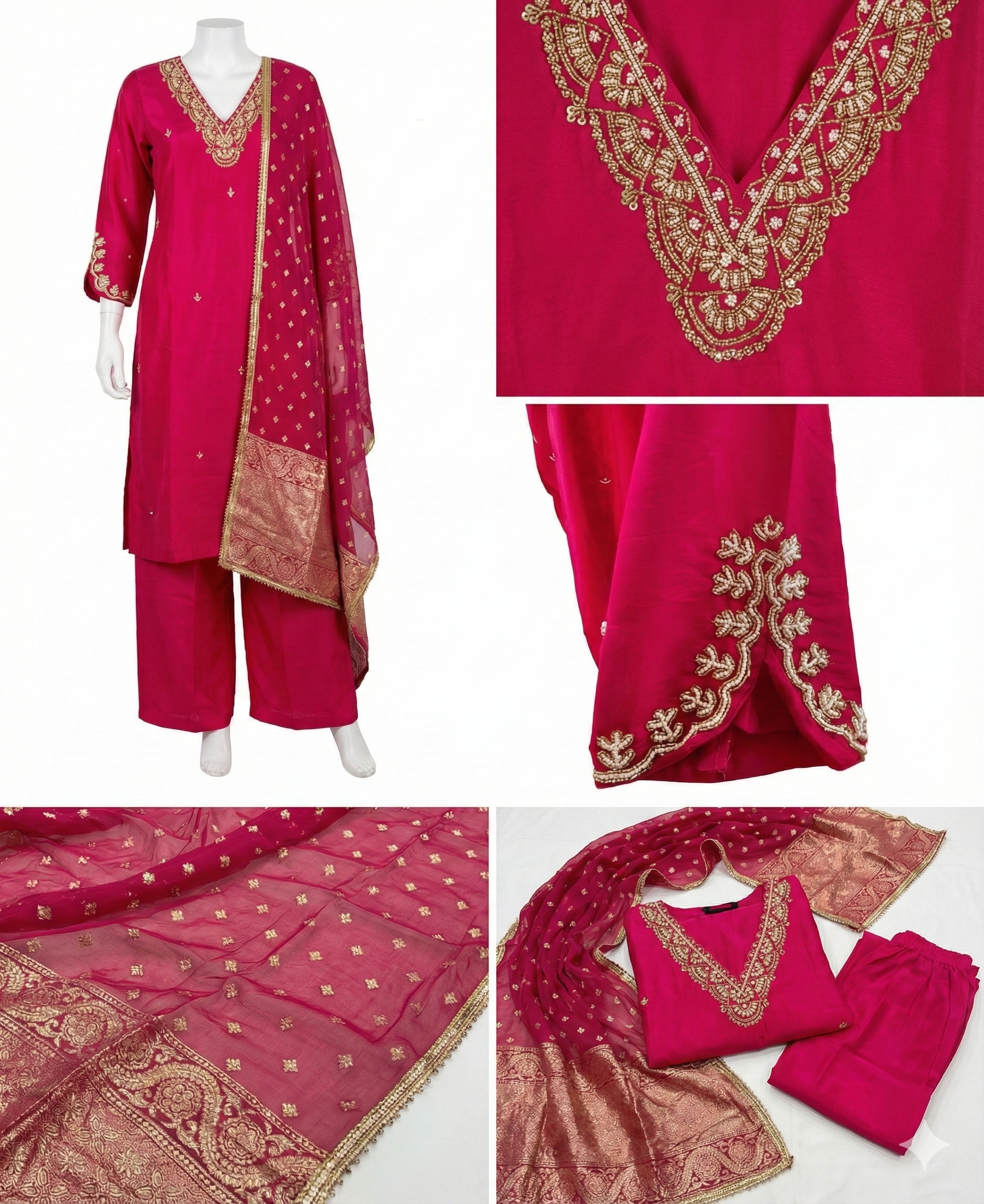 Straight Fit Kurti Set – Pink kurti with v-neck Maggam work and elegant sleeves, paired with a Grand Dupatta. (ROMAN SILK Fabric with Inner Lining)