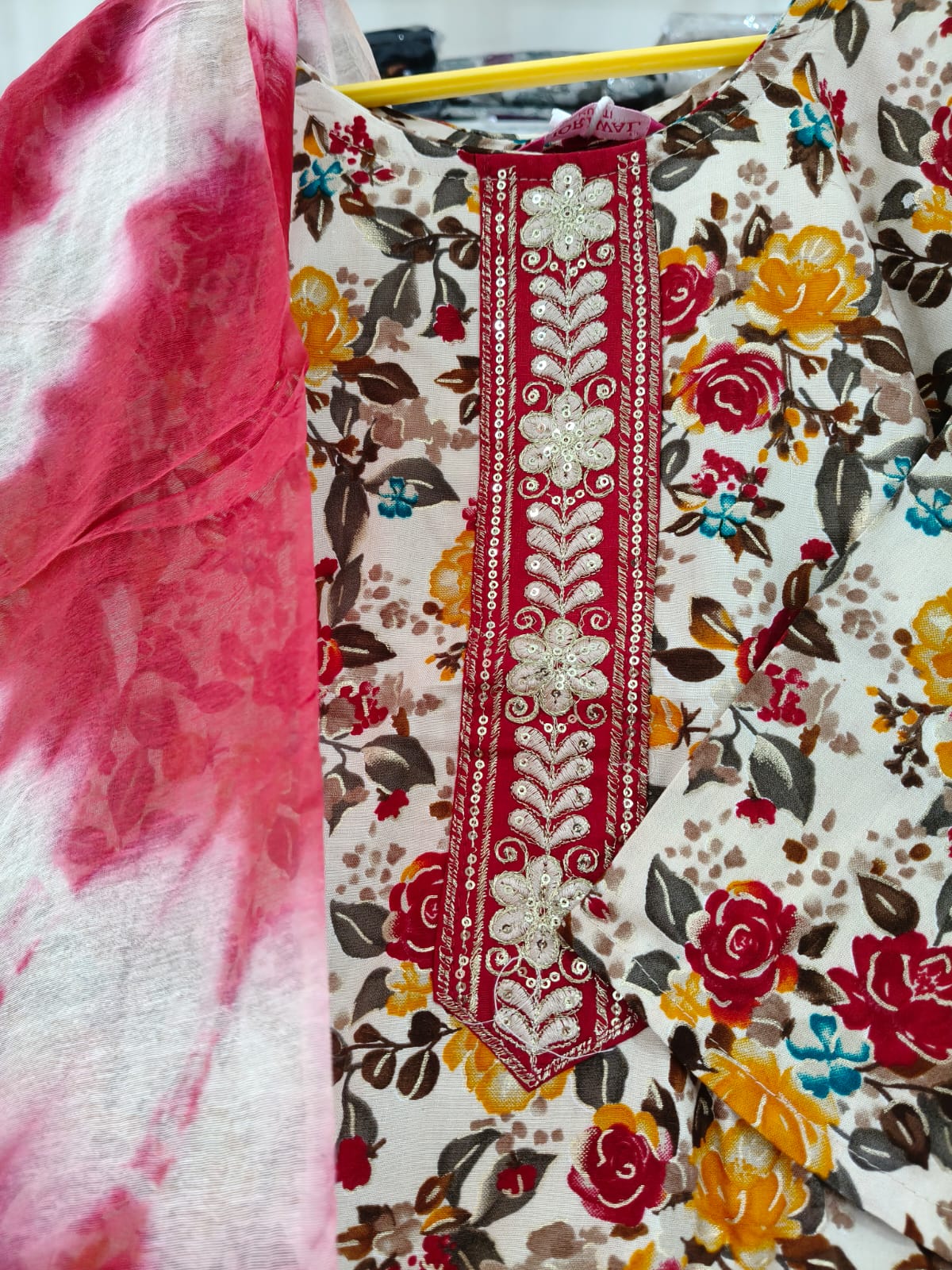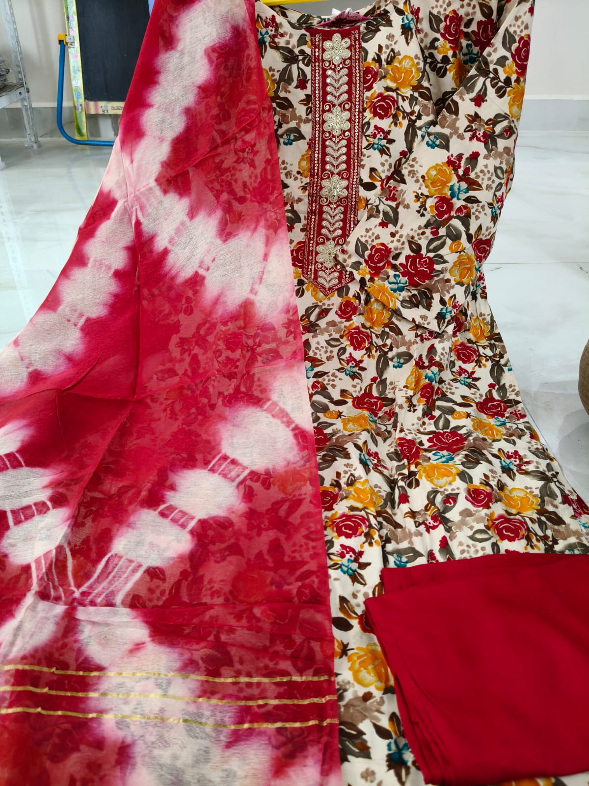 Straight Fit Kurti Set – Floral printed kurti with embroidered neckline, chiffon dupatta with zari lines, and running bottom. (SLUB COTTON Fabric)