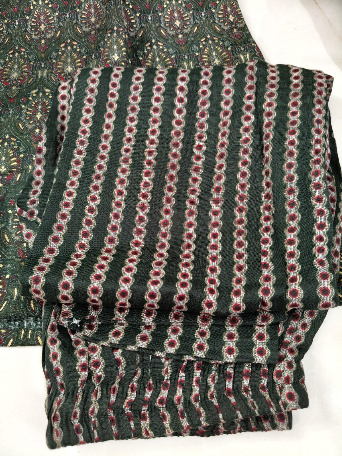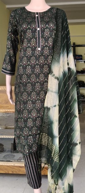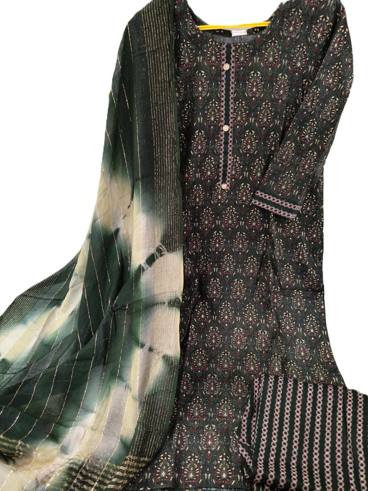 Straight Fit Kurti Set – Green kurti with gold floral print and 3/4 sleeves, striped bottom, and tie-dye chiffon dupatta with gold zari lines. (SOFT RAYON Fabric)