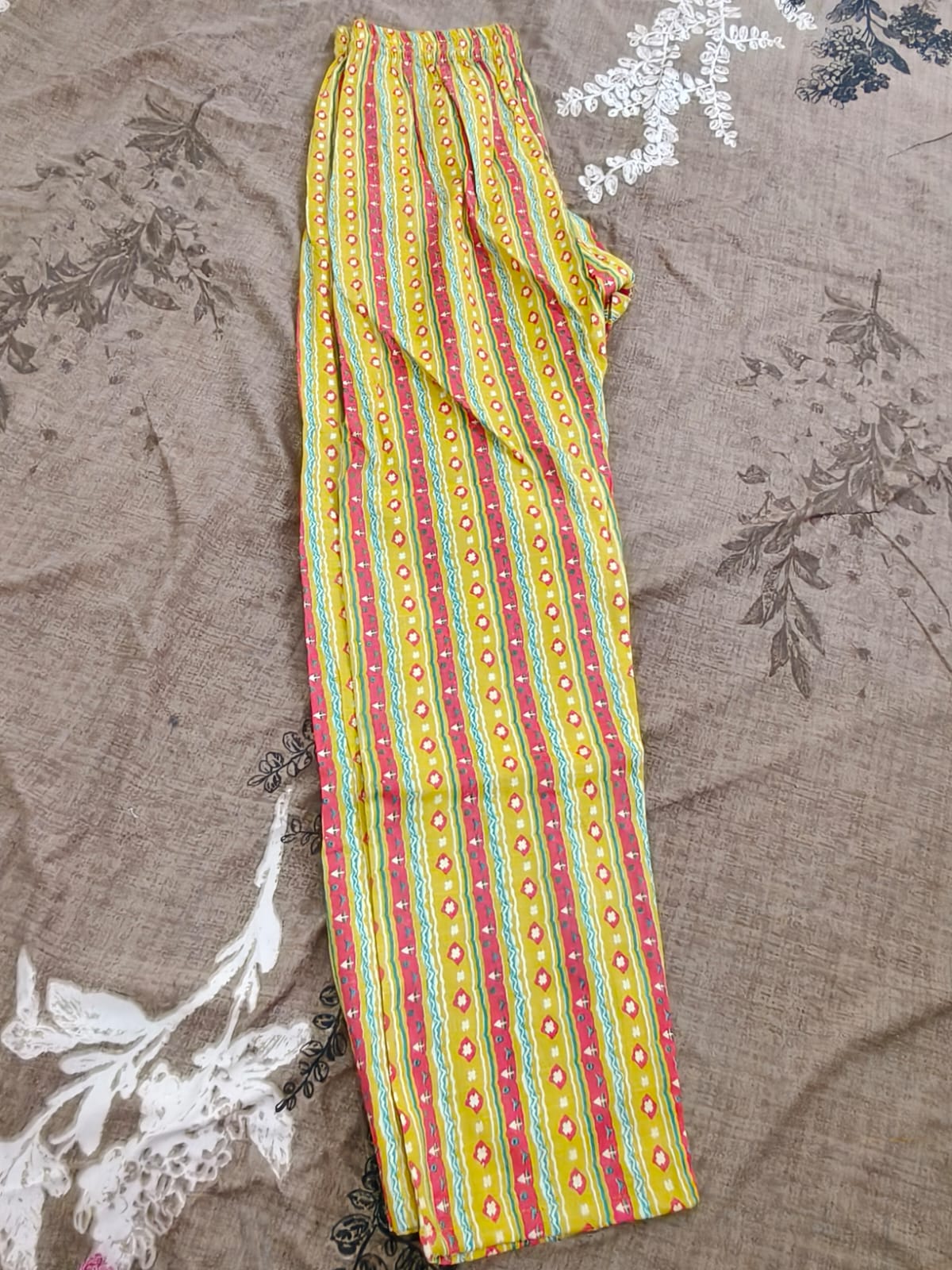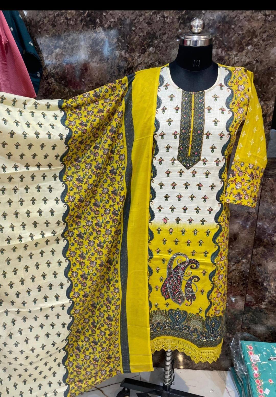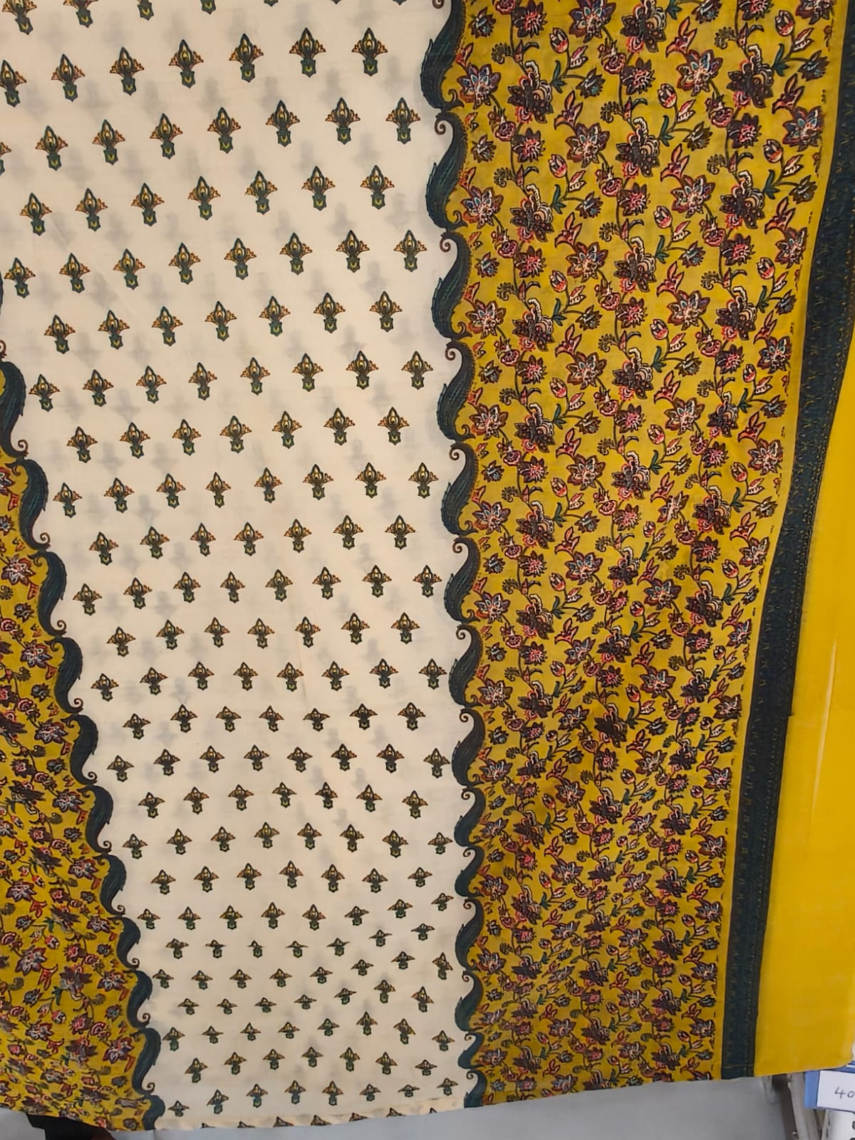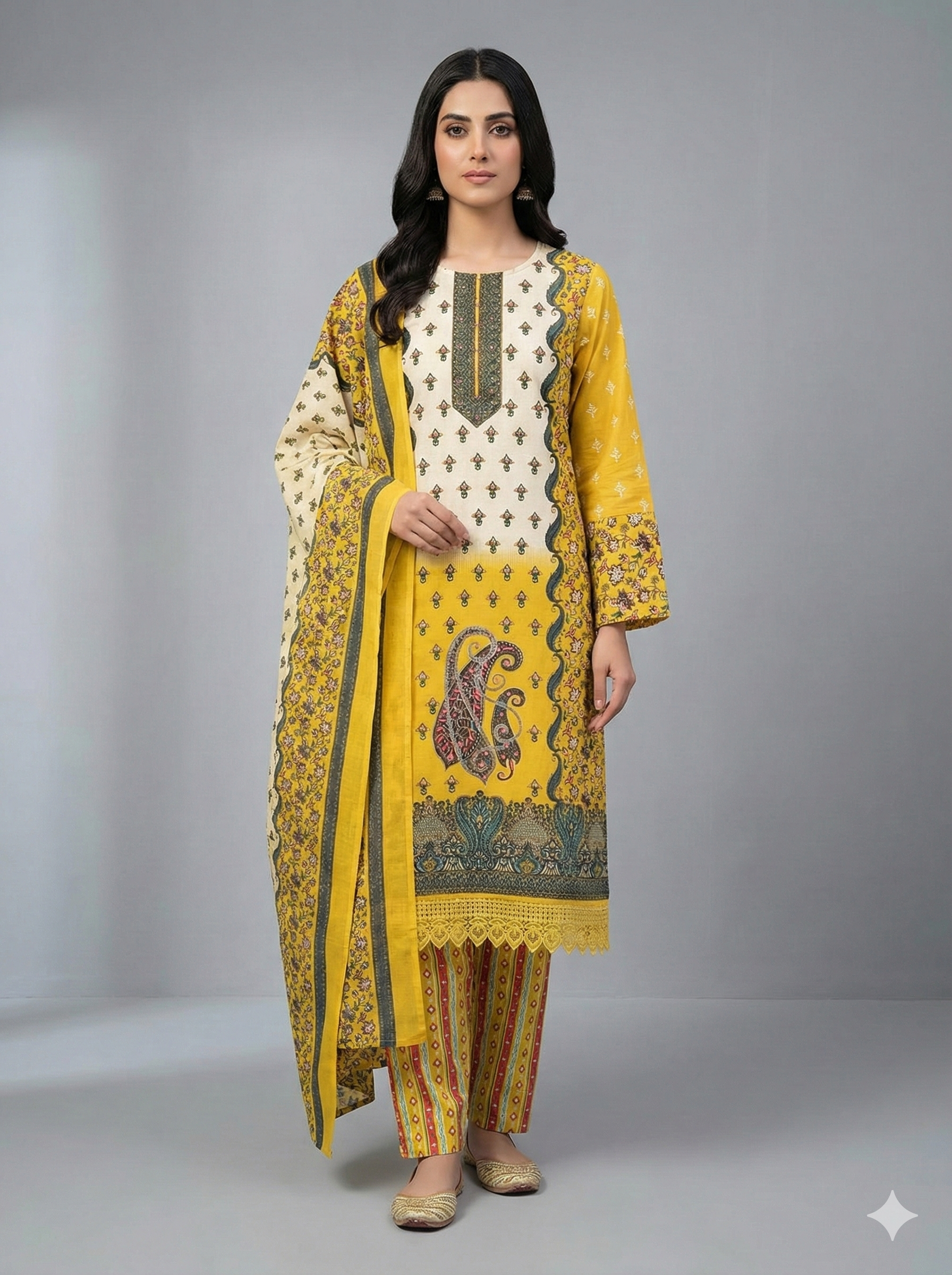 Straight Fit Suit Set – White fabric with yellow border and black scalloped detailing, paired with floral print dupatta and bottom. (COTTON Fabric)