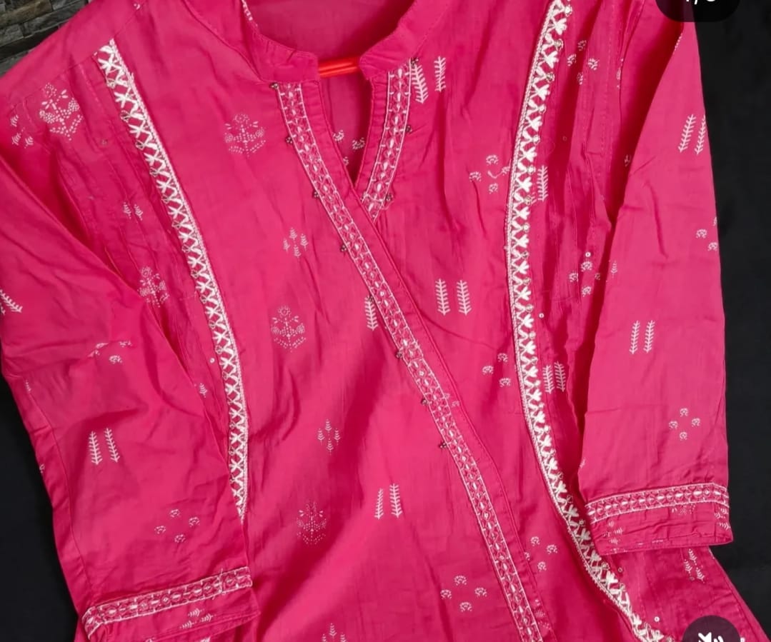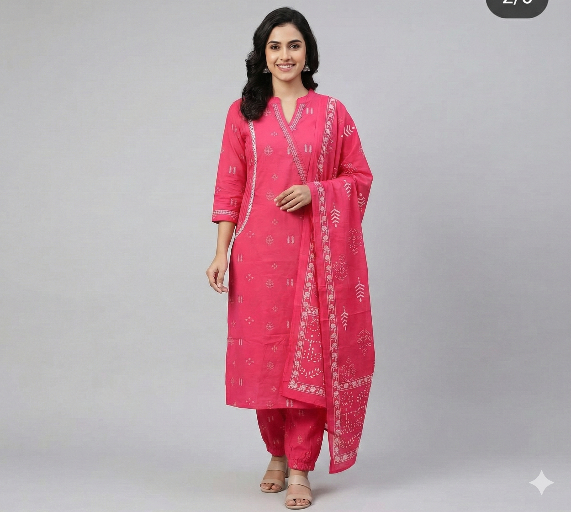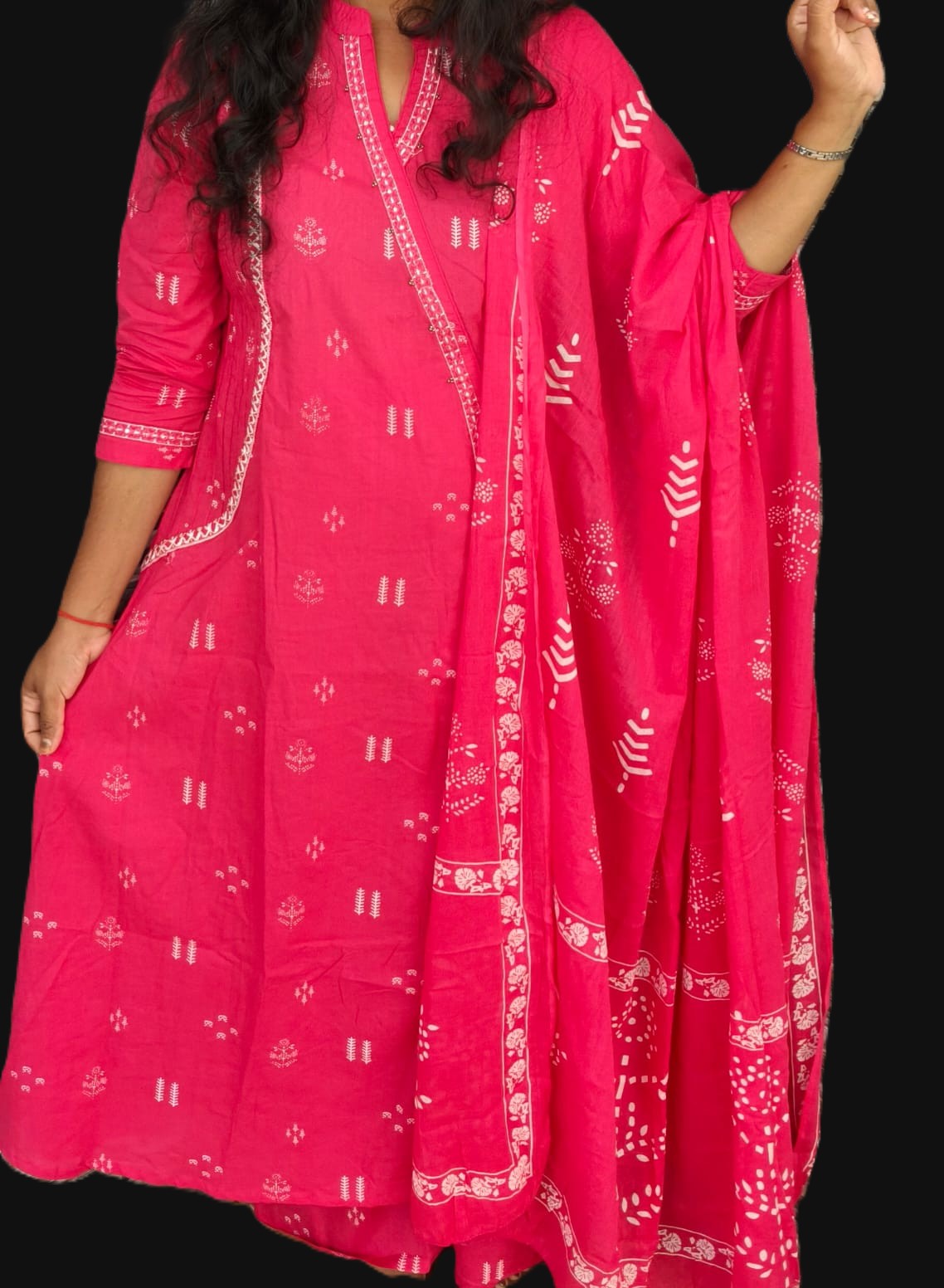 A-Line Fit Kurti Set – A-line kurti with white printed motifs and embroidered neckline, white printed dupatta, and cotton palazzo bottom. (PURE COTTON Fabric)